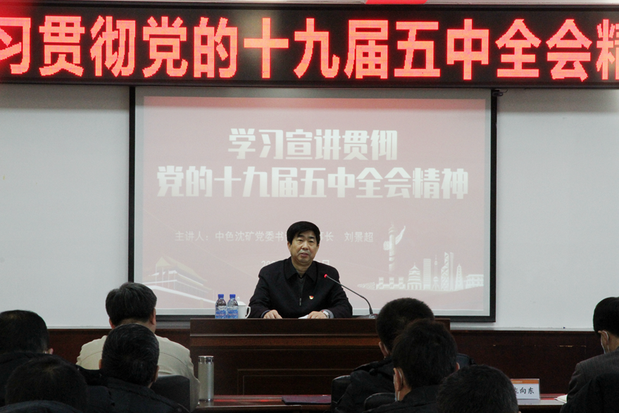 12月18日上午,中色沈礦董事長、黨委書記劉景超到鐵嶺藥劑宣講黨的十九屆五中全會精神。