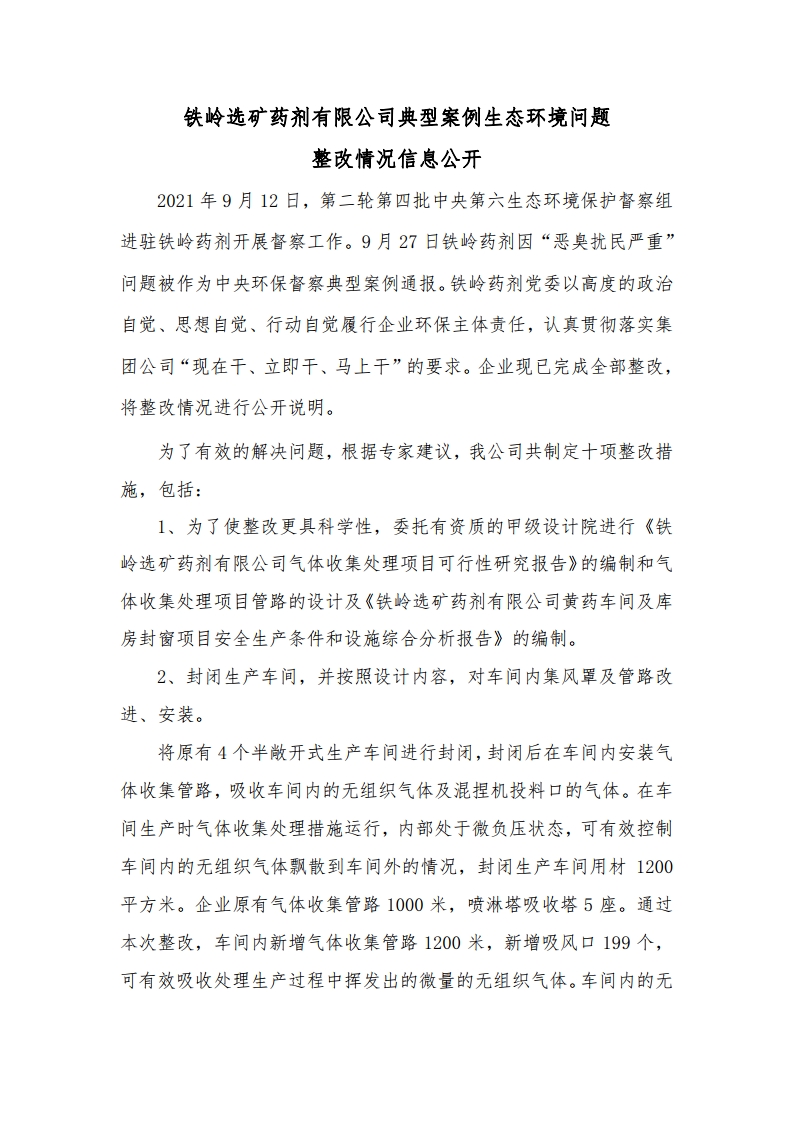 鐵嶺選礦藥劑有限公司典型案例生態環境問題 整改情況信息公開