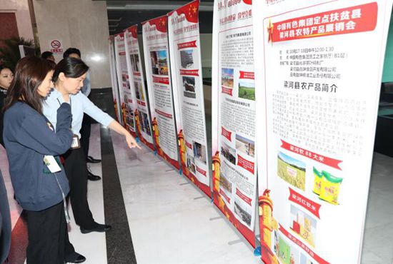 中國有色集團舉辦定點扶貧梁河縣農特產品展銷會 展銷會上,中國有色集團工會組織大冶有色、中國十五冶和中色國貿三家企業工會與參展廠商進行了接洽,共簽訂集中采購合同額達54萬余元。集團公司總部和京內各企業干部職工積極踴躍購買貧困縣產品,活動首日職工個人采購總額超萬元。